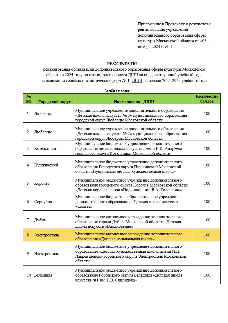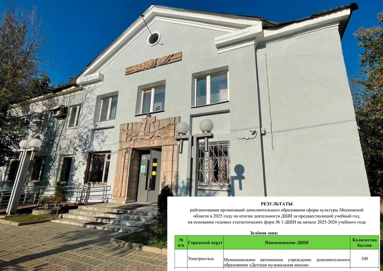 На основании годовых статистических форм № 1-ДШИ на начало 2025-2026 учебного года, наша школа успешно удержала позицию в престижной "зелёной зоне" набрав максимальное количество баллов и третий год является одной из лучших среди 166 музыкальных школ Подмосковья.