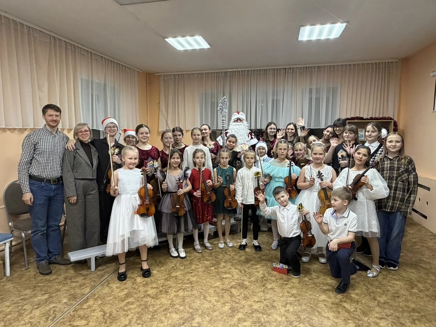 22 декабря состоялся Новогодний концерт отдела струнно-смычковых инструментов. В нём приняли участие юные скрипачи и виолончелисты. Ребята не только получили подарки от Деда Мороза и Снегурочки, но и сами подготовили музыкальный номер, сыграв песенку про Елочку всем дружным коллективом от мала до велика!